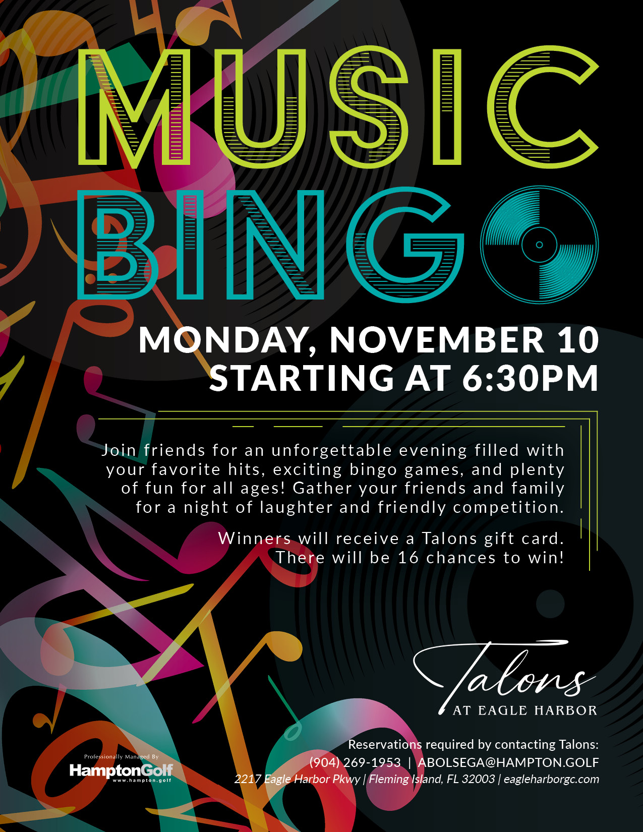 Come by and indulge yourself, meet friends, or make new ones, and enjoy the beautiful surroundings at Eagle Harbor Golf Club and Talons. For questions regarding Talons' weekly events please call 904-269-1953. For information on booking a private event please call 904-269-9300 ex. 5 or visit our Special Events Page.