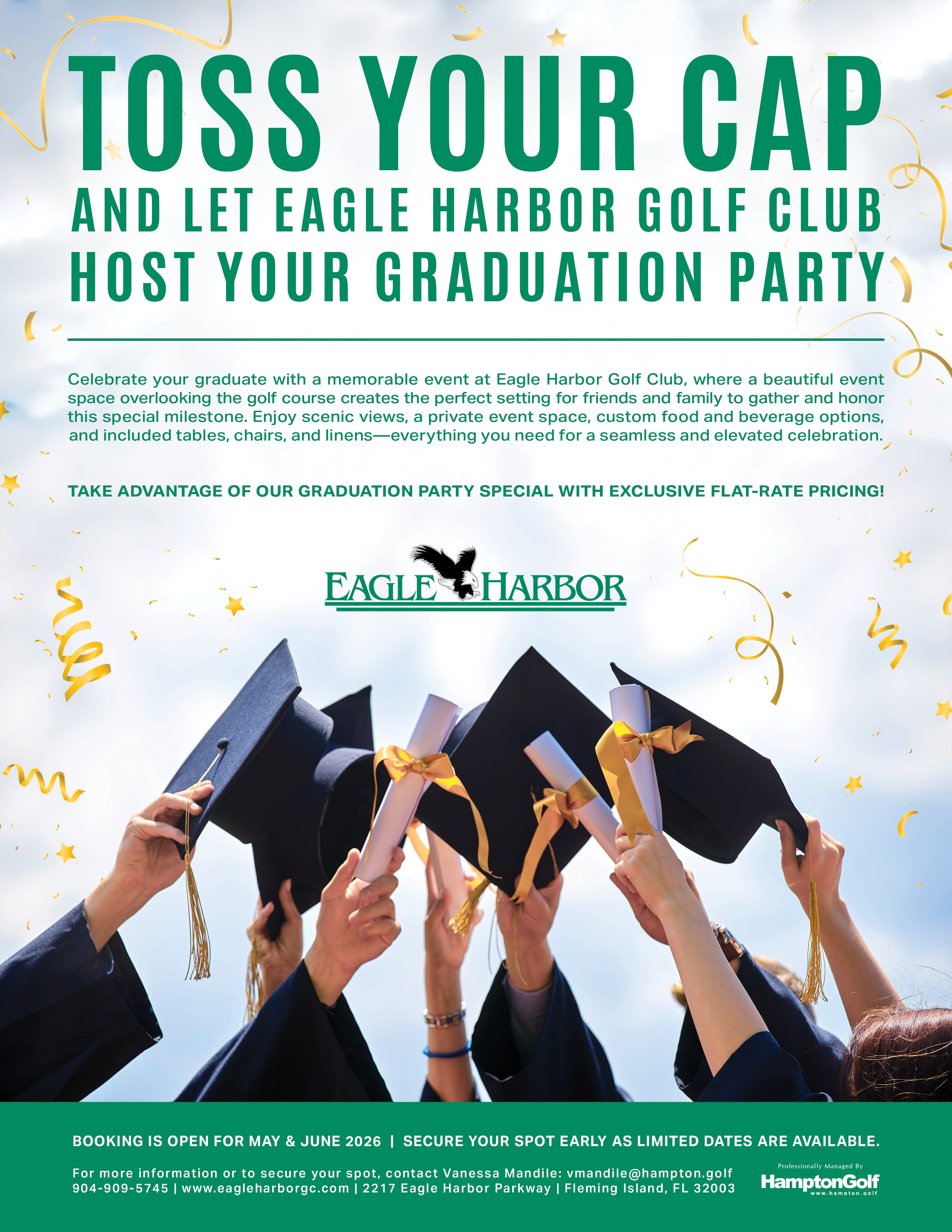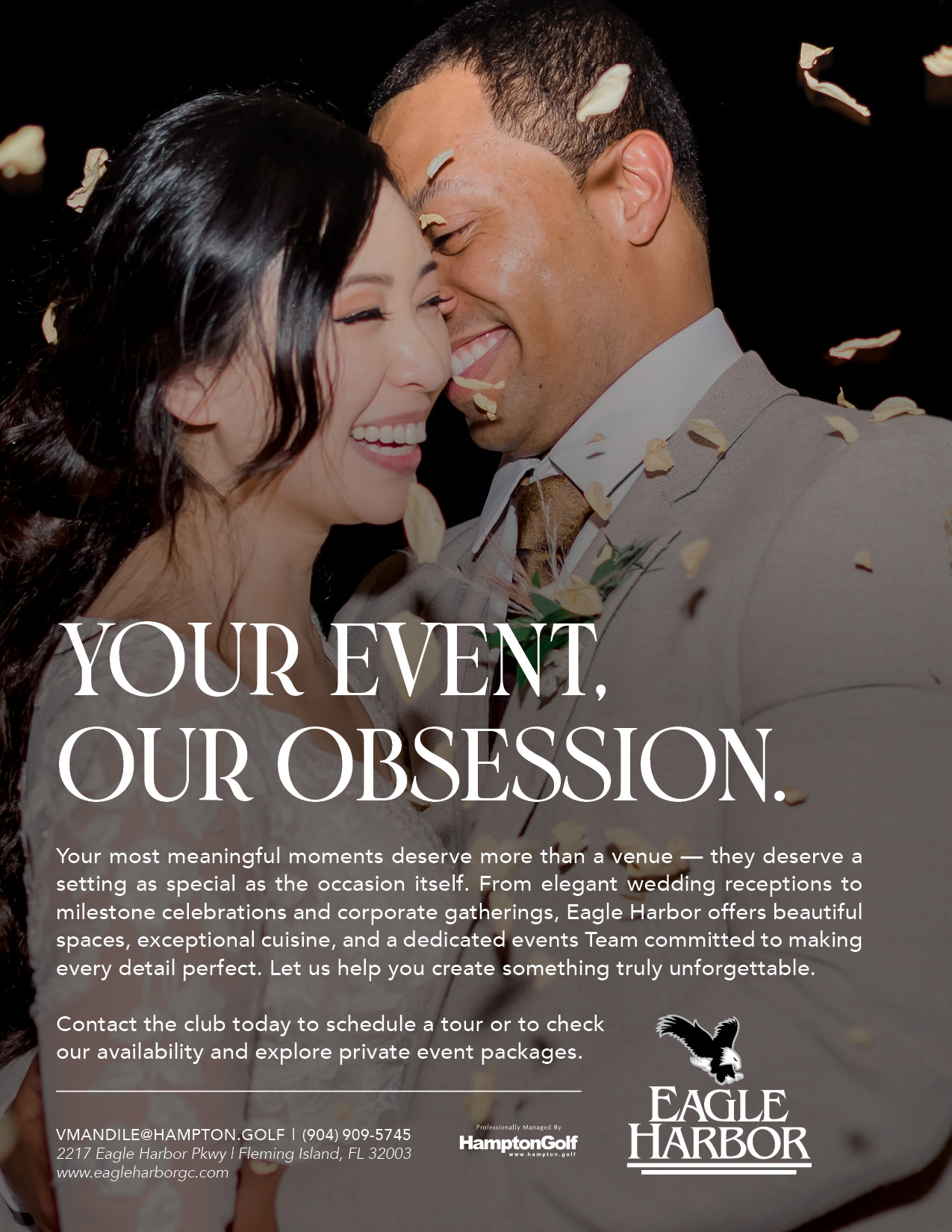 Whether it’s a corporate gathering, birthday party, baby shower, banquet, anniversary or other special occasion, Eagle Harbor Golf Club is committed to helping you plan the perfect event. The premiere setting for your event, located 21 miles southwest of downtown Jacksonville, Eagle Harbor is situated in the heart of northeast Florida between the St. Johns River and Doctors Lake on beautiful Fleming Island, FL. The club offers fabulous event spaces and gorgeous outdoor features including the Banquet Room, Wine Room, Back Patio, Ceremony location and a Get-Ready Suite. Our elegant meeting and event facilities can accommodate as little as 10 people for an intimate cocktail reception or meeting, up to 130 guests for sit-down dining and dancing. Professional and experienced staff will help make your event memorable, beautiful and stress-free.
